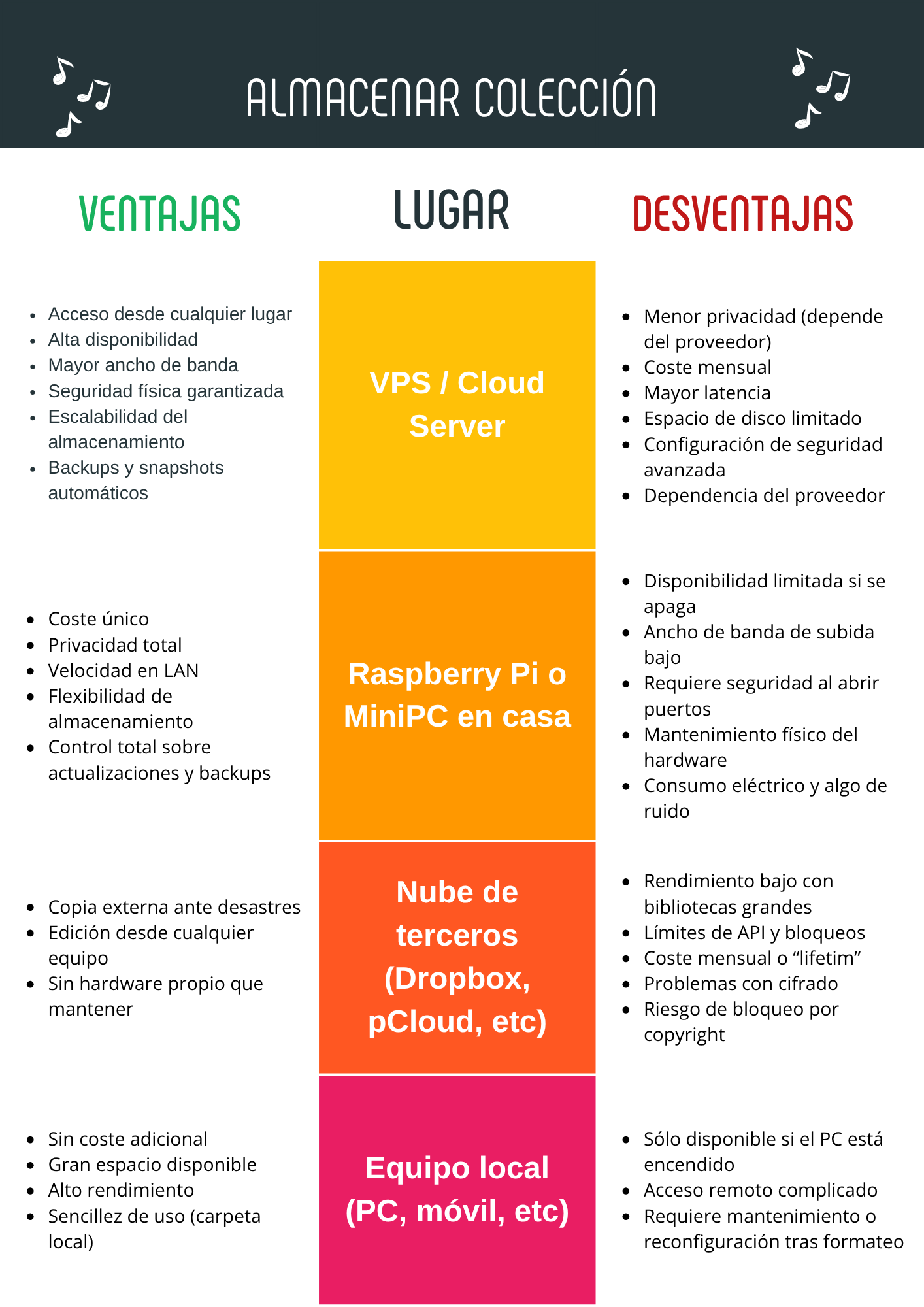 Para ayudarte a decidir qué opción se adapta mejor a tus necesidades, he preparado esta tabla comparativa con las distintas formas de almacenar tu colección musical, junto con sus principales ventajas y desventajas.