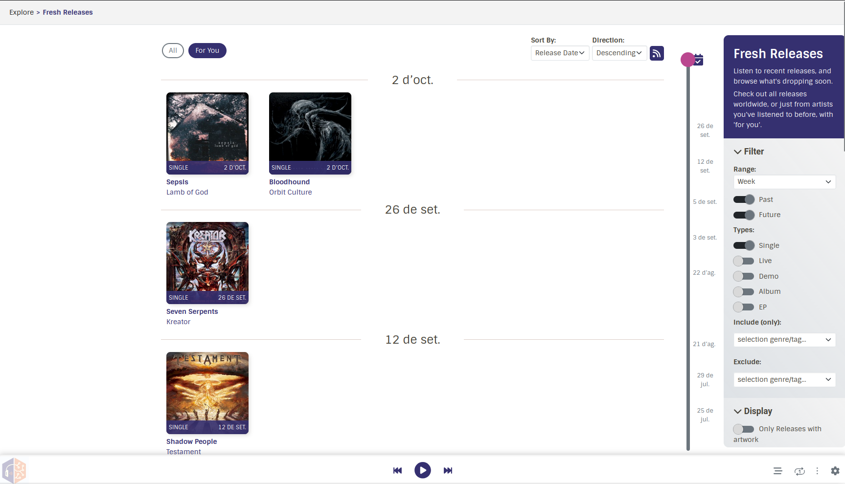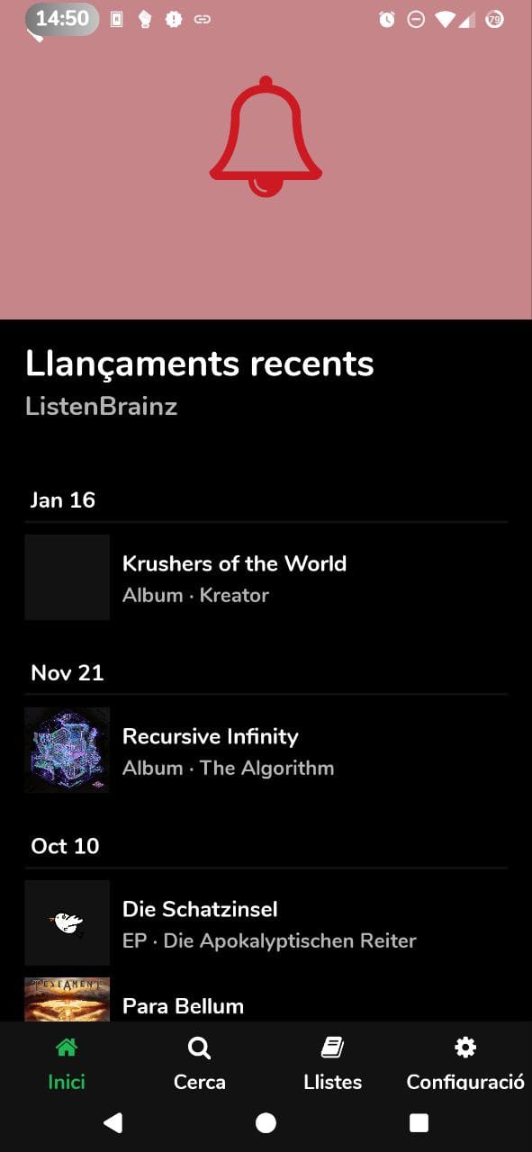 - Podemos usar ListenBrainz para esto. En su web encontrarás una sección llamada Releases, donde puedes ver en detalle las novedades basadas en tu historial de escucha. Es importante tener en cuenta que, si un grupo no forma parte de tu biblioteca en Navidrome, no recibirás avisos sobre sus nuevos lanzamientos. Esta función también está disponible en algunas aplicaciones como Castafiore, que incluye un apartado de notificaciones donde se muestran los discos nuevos de tus artistas favoritos.