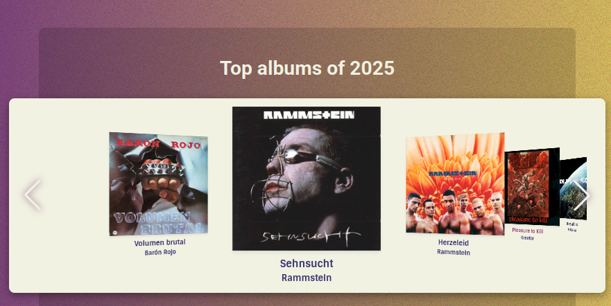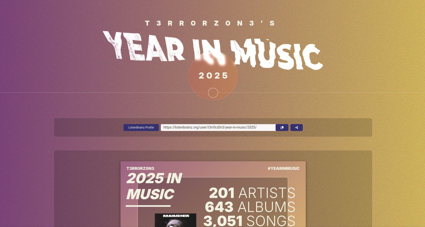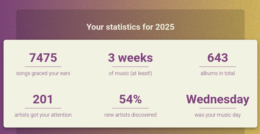 He encontrado un proyecto que permite montar una imagen rollo #SpotifyWrapped. Se llama Listenbrainz-wrapped y si quieres puedes montarlo en local en tu ordenador. Pero si no te quieres liar, el desarrollador ha montado esta web donde con poner el nombre de usuario de tu cuenta de ListenBrainz (sin iniciar sesión ni nada) puedes generar la imagen: https://wrapped.devmatei.com/